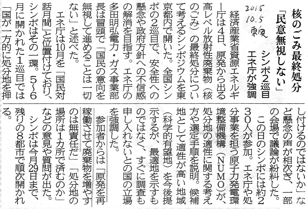 | [2015_10_05_01]核のごみ最終処分 「民意無視しない」 シンポ2巡目 エネ庁が強調 (東奥日報2015年10月5日) |