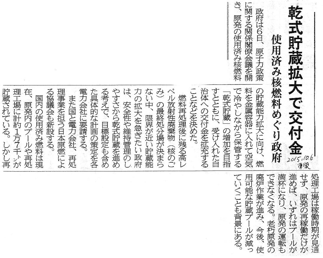 | [2015_10_06_01]乾式貯蔵拡大で交付金 使用済み核燃料めぐり政府 (東奥日報2015年10月6日) |