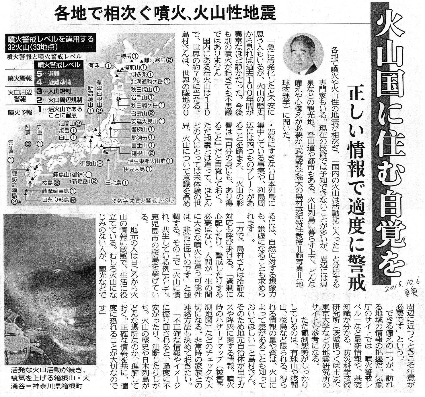 [2015_10_06_02]火山国に住む自覚を 正しい情報で適度に警戒 各地で相次ぐ噴火、火山性地震 (東奥日報2015年10月6日)