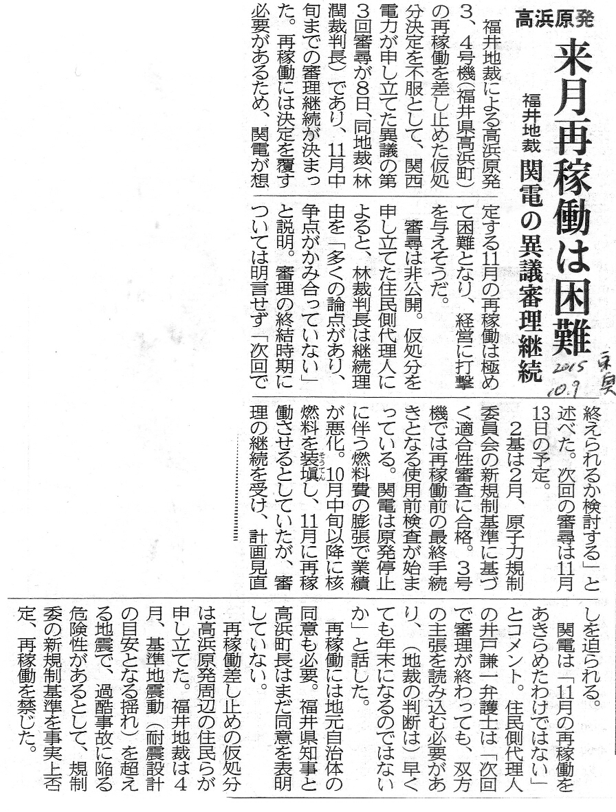 [2015_10_09_01]高浜原発 来月再稼働は困難 福井地裁 関電の異議審理継続 (東奥日報2015年10月9日)