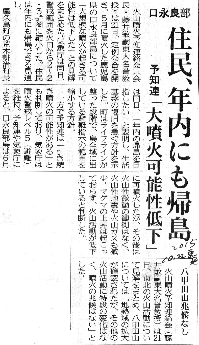 [2015_10_22_01]口永良部 住民、年内にも帰島 予知連「大噴火可能性低下」 (東奥日報2015年10月22日)