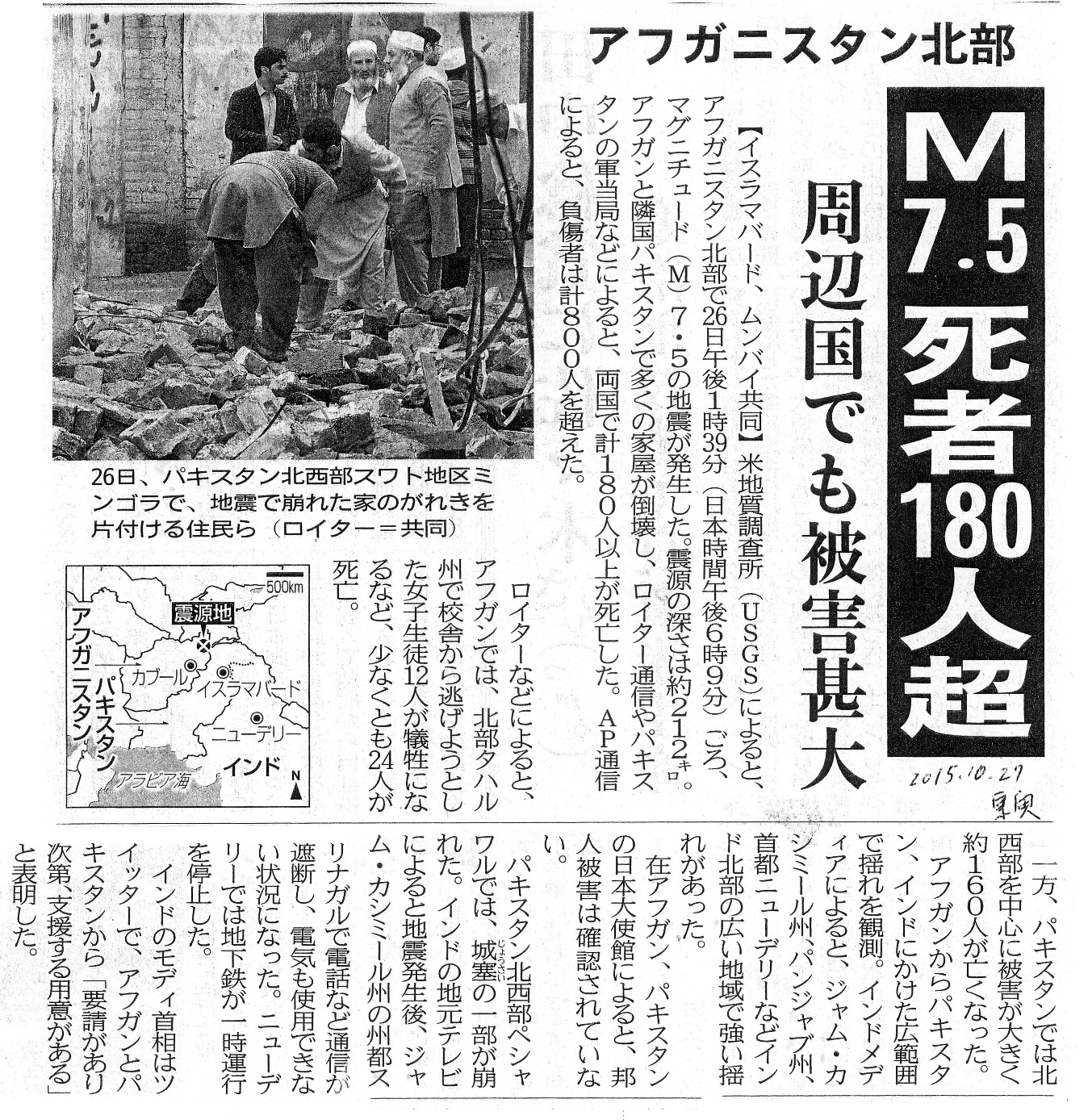 [2015_10_27_02]アフガニスタン北部 M7.5 死者180人超 周辺国でも被害甚大 (東奥日報2015年10月27日)