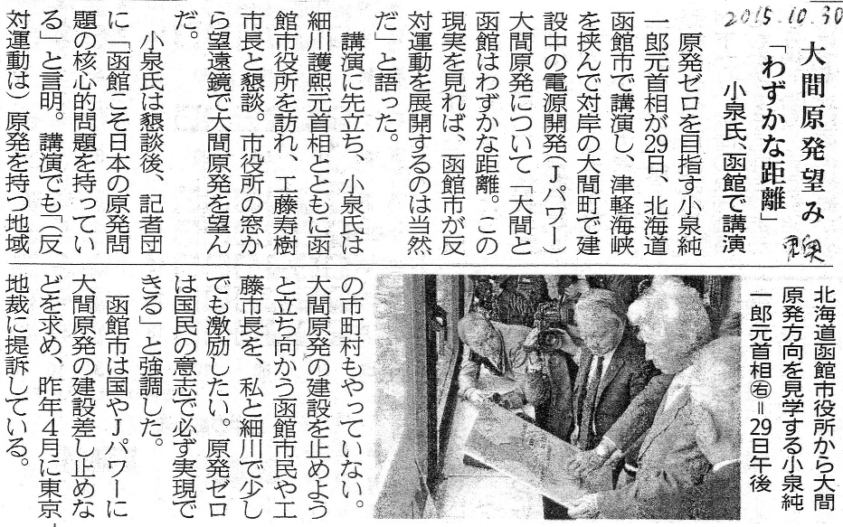 | [2015_10_30_01]大間原発望み 「わずかな距離」 小泉氏、函館で講演 (東奥日報2015年10月30日) |