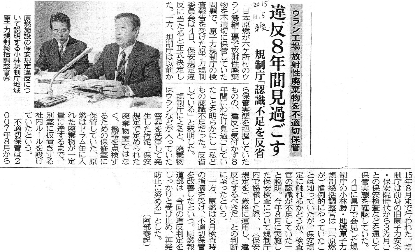 | [2015_11_05_01]ウラン工場 放射性廃棄物を不適切保管 違反8年間見過ごす 規制庁「認識不足を反省」 (東奥日報2015年11月5日) |