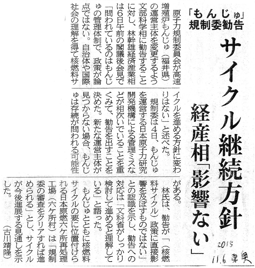 | [2015_11_06_02]「もんじゅ」規制委勧告 サイクル継続方針 経産相「影響ない」 (東奥日報2015年11月6日) |