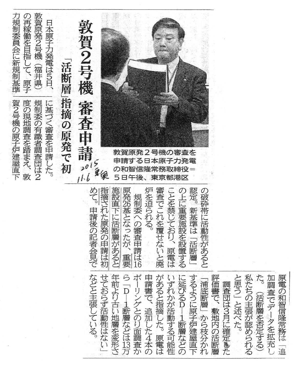| [2015_11_06_03]敦賀2号機 審査申請 「活断層」指摘の原発で初 (東奥日報2015年11月6日) |