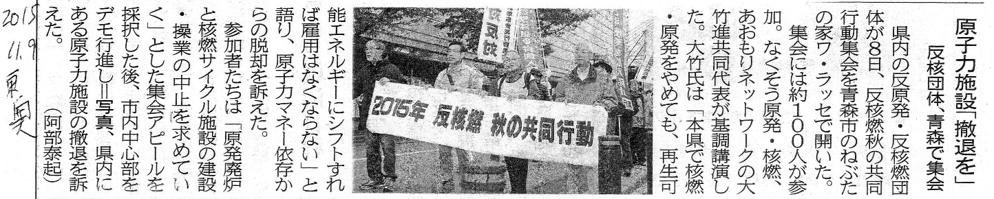 [2015_11_09_01]原子力施設「撤退を」 反核団体、青森で集会 (東奥日報2015年11月9日)
