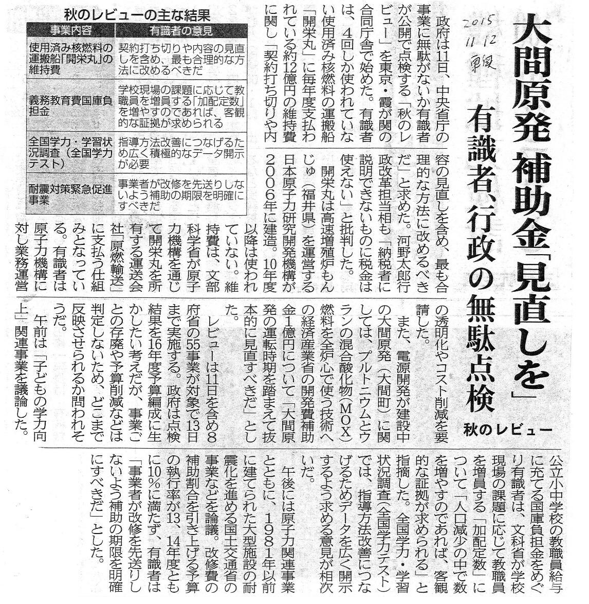 | [2015_11_12_01]大間原発補助金「見直しを」 有識者、行政の無駄点検 (東奥日報2015年11月12日) |