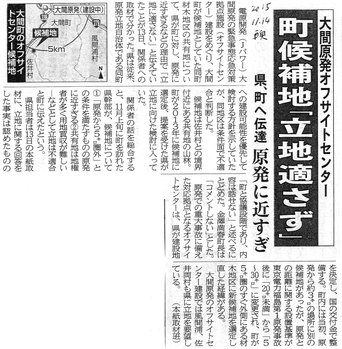 | [2015_11_14_03]大間原発オフサイトセンター 町候補地「立地適さず」 県、町へ伝達 原発に近すぎ (東奥日報2015年11月14日) |