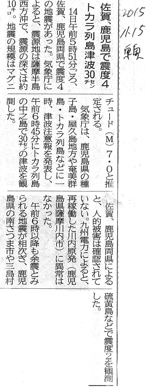 | [2015_11_15_01]佐賀、鹿児島で震度4 トカラ列島津波30センチ (東奥日報2015年11月15日) |