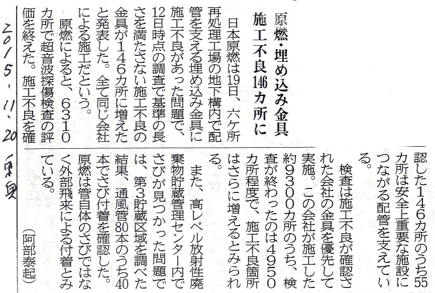 | [2015_11_20_01]原燃・埋め込み金具 施工不良146カ所に(東奥日報2015年11月20日) |
