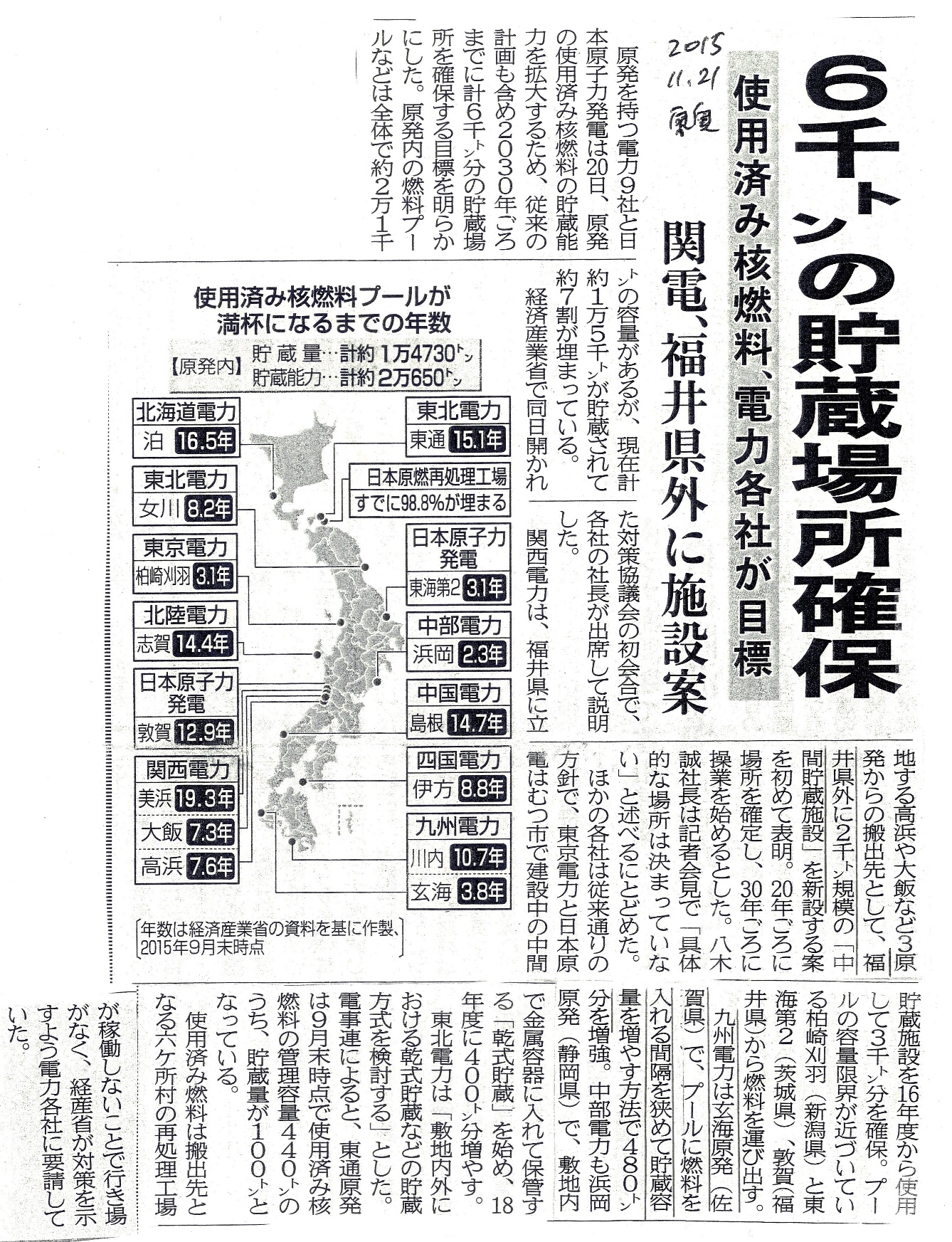 | [2015_11_21_01]6千トンの貯蔵場所確保 使用済み核燃料、電力会社が目標 関電、福井県外に施設案(東奥日報2015年11月21日) |