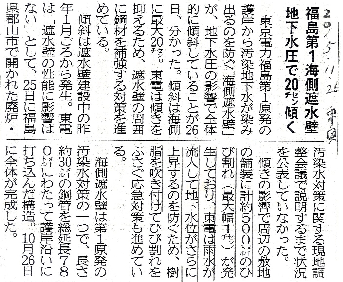 | [2015_11_26_02]福島第1海側遮水壁 地下水圧で20センチ傾く(東奥日報2015年11月26日) |