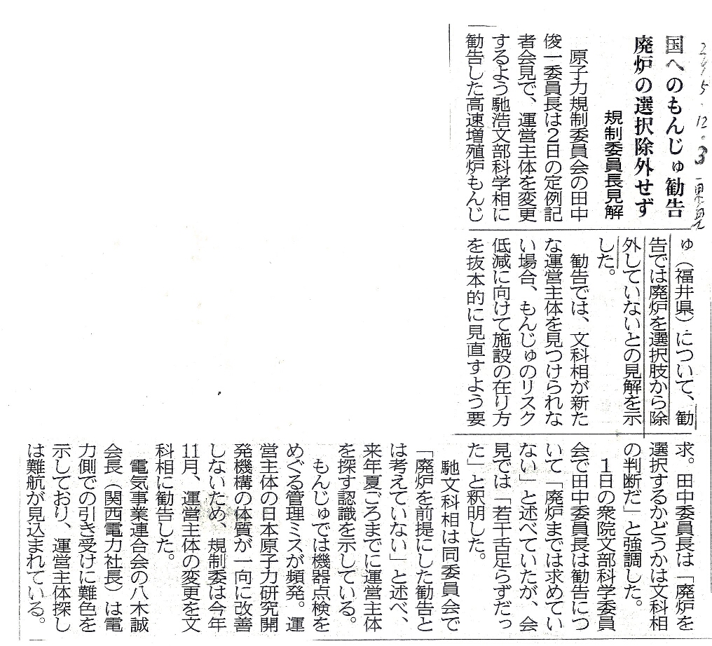 ※以下は上記本文中から重要と思われるヶ所を抜粋し、テキスト化したものである 原子力規制委員会の田中俊一委員長は2日の定例記者会見で、運営主体を変更するよう馳浩文部科学相に勧告した高速増殖炉もんじゅ(福井県)について、勧告では廃炉を選択肢から除外していないとの見解を示した。(中略) 電気事業連合会の八木誠会長(関西電力社長)は電力側での引き受けに難色を示しており、運営主体探しは難航が見込まれている。 |
