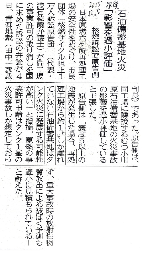 | [2015_12_05_01]石炭備蓄基地火災 「影響を過小評価」 核燃訴訟で原告側(東奥日報2015年12月5日) |