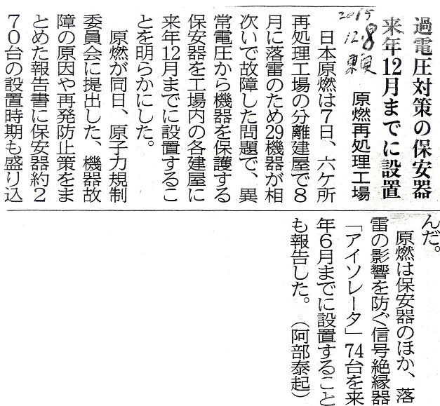 | [2015_12_08_01]過電圧対策の保安器 来年12月までに設置 原燃再処理工場(東奥日報2015年12月8日) |