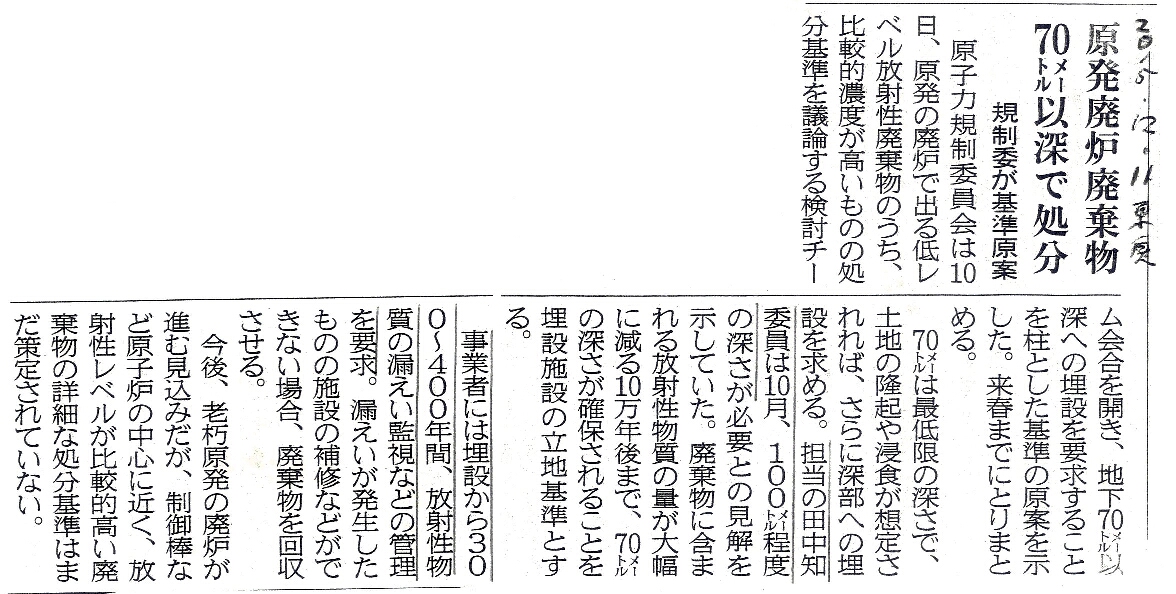 [2015_12_11_01]原発廃炉廃棄物 70メートル以深で処分 規制委が基準原案(東奥日報2015年12月11日)