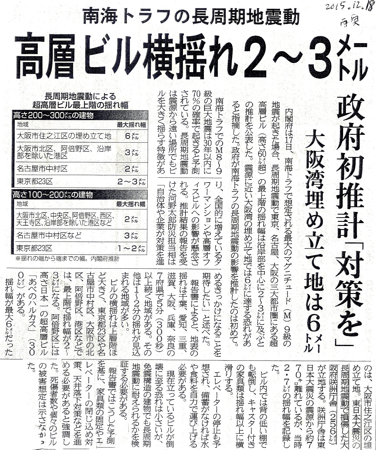 [2015_12_18_03]南海トラフの長周期地震動 高層ビル横揺れ2〜3メートル 政府初推計 「対策を」 大阪湾埋め立て地は6メートル(東奥日報2015年12月18日)