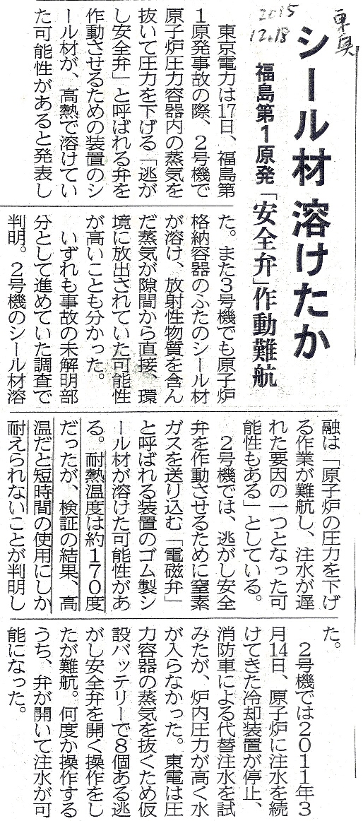 [2015_12_18_04]シール材 溶けたか 福島第1原発 「安全弁」作動難航(東奥日報2015年12月18日)