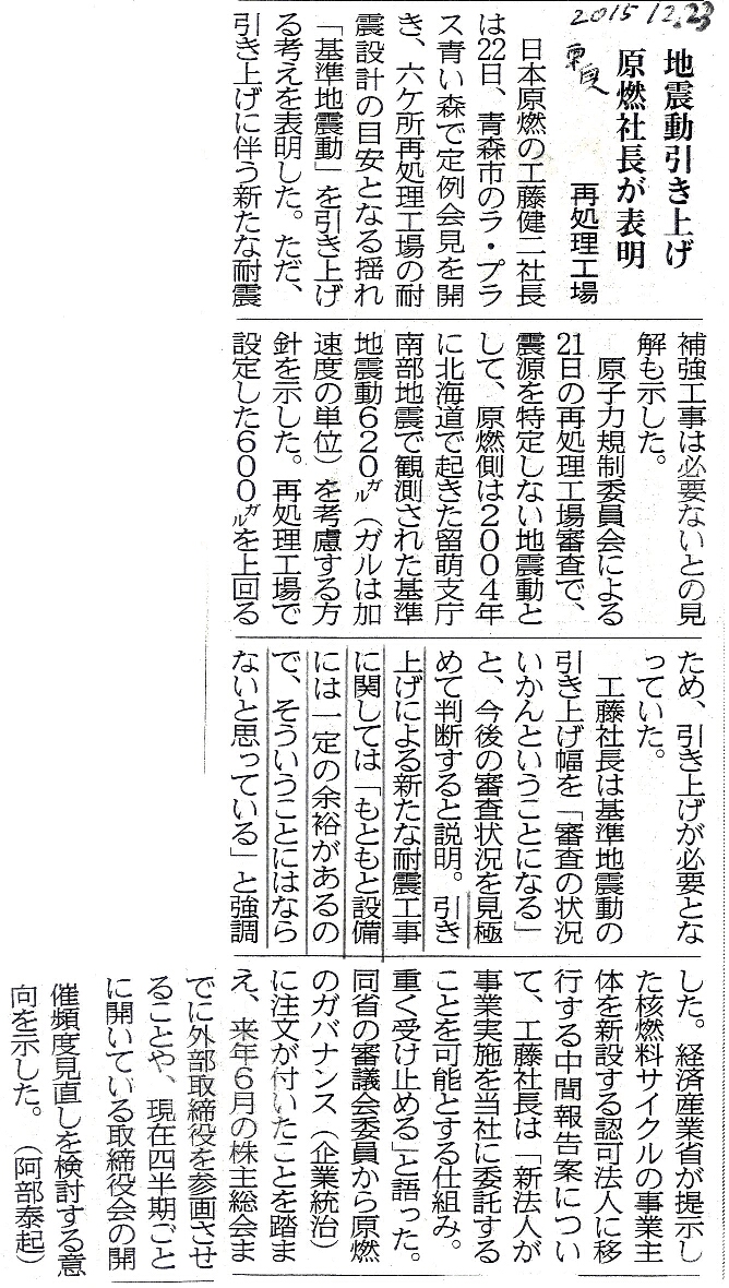 | [2015_12_23_01]地震動引き上げ 原燃社長が表明 再処理工場(東奥日報2015年12月23日) |
