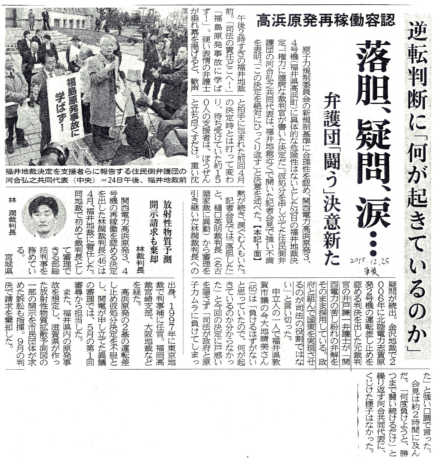 [2015_12_25_01]高浜原発再稼働容認 逆転判断に「何がおきているのか」 落胆、疑問、涙・・・ 弁護団「戦う」決意新た 林裁判長 放射性物質予測開示請求も棄却(東奥日報2015年12月25日)