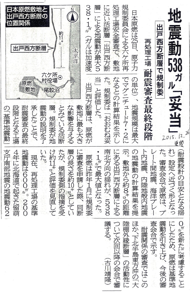 | [2015_12_26_01]地震動538ガル「妥当」 出戸西方断層で規制委 再処理工場 耐震審査最終段階(東奥日報2015年12月26日) |