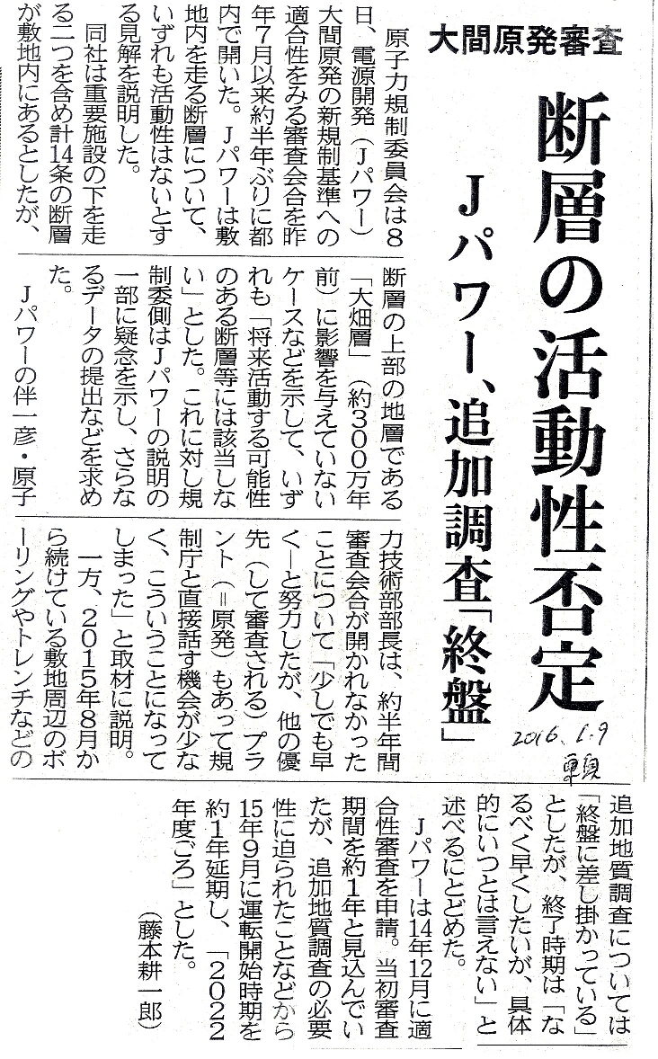 | [2016_01_09_01]大間原発審査 断層の活動性否定 Jパワー、追加調査「終盤」(東奥日報2016年1月9日) |