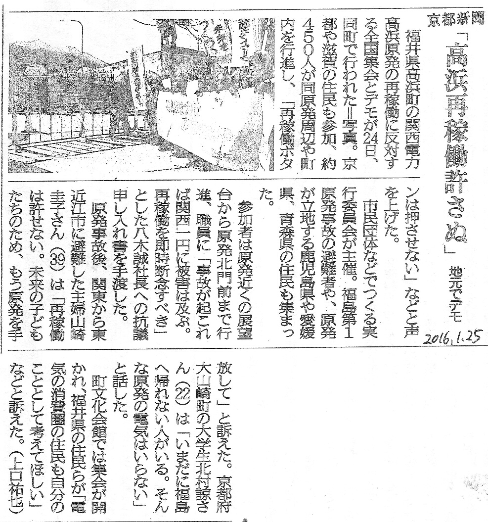 | [2016_01_25_01]「高浜再稼働許さぬ」 地元でデモ(京都新聞2016年1月25日) |