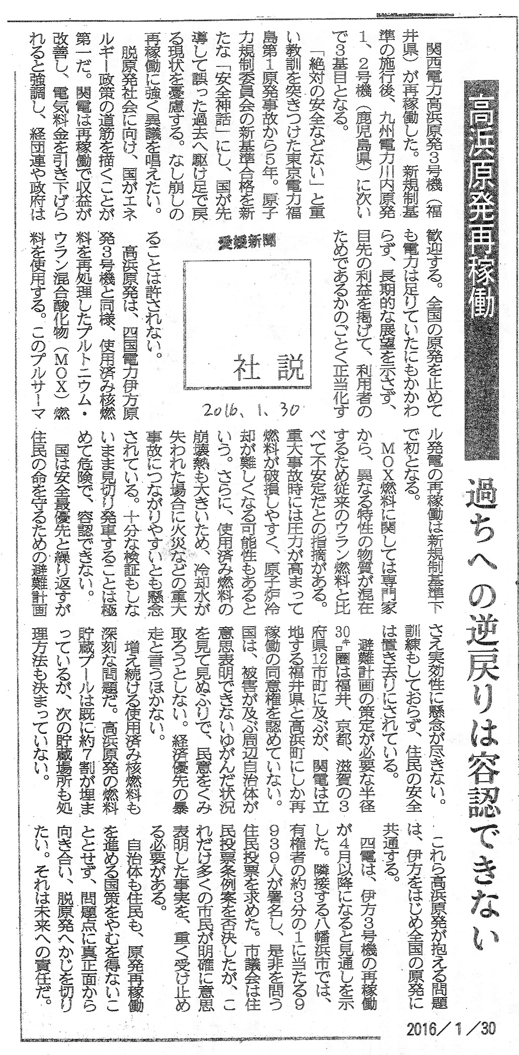 [2016_01_30_03]高浜原発再稼働 過ちへの逆戻りは容認できない 社説(愛媛新聞2016年1月30日)