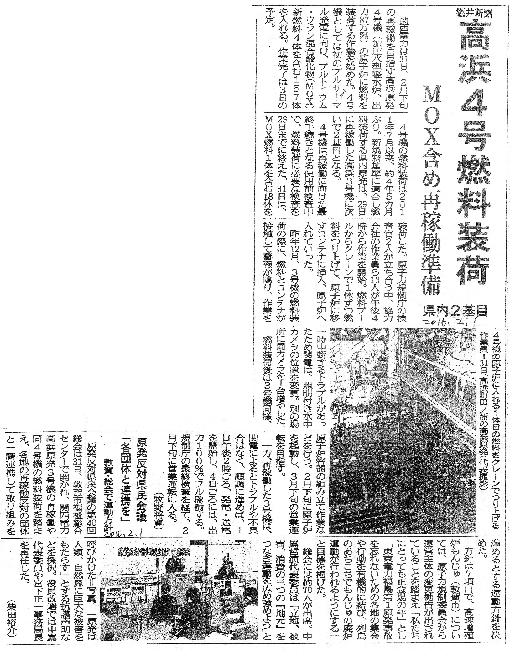 [2016_02_01_01]高浜原発4号燃料装荷 MOX含め再稼働準備 県内2基目 原発反対県民会議 「各団体と連携を」 敦賀・総会で運動方針(福井新聞2016年2月1日)