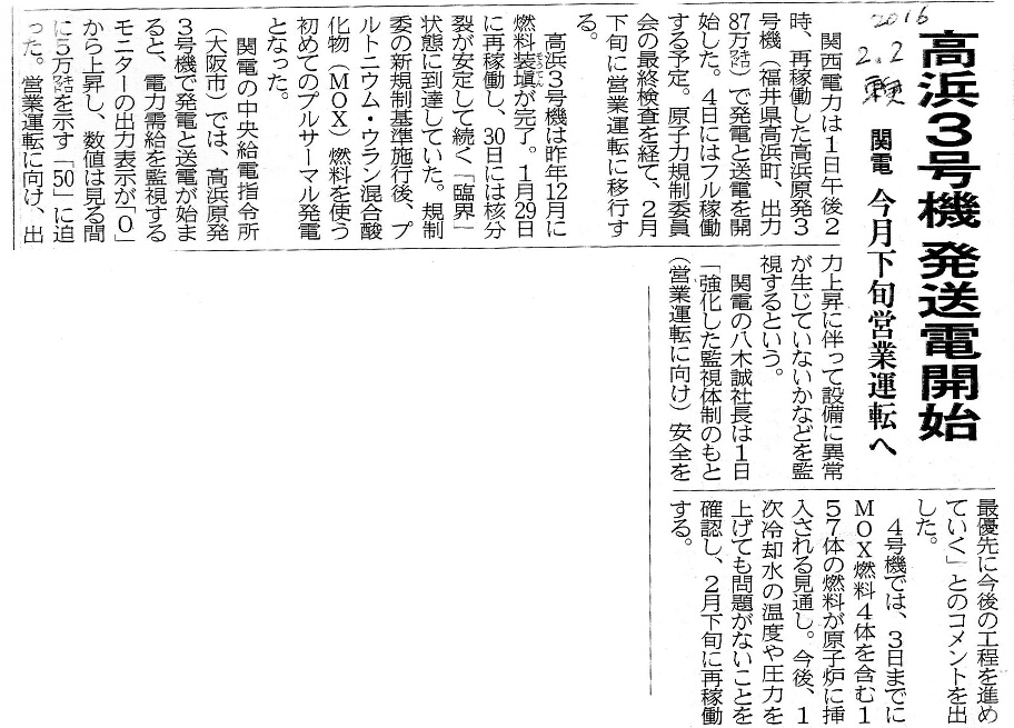 [2016_02_02_01]高浜3号機 発送電開始 関電 今月下旬営業運転へ(東奥日報2016年2月2日)