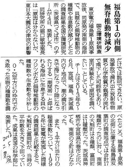 [2016_02_05_01]福島第1の南側 無脊椎動物減少 国立環境研調査(東奥日報2016年2月5日)