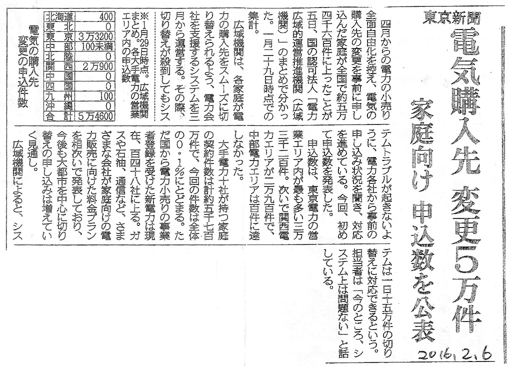 [2016_02_06_01]電気購入先 変更5万件 家庭向け 申込数を公表(東京新聞2016年2月6日)