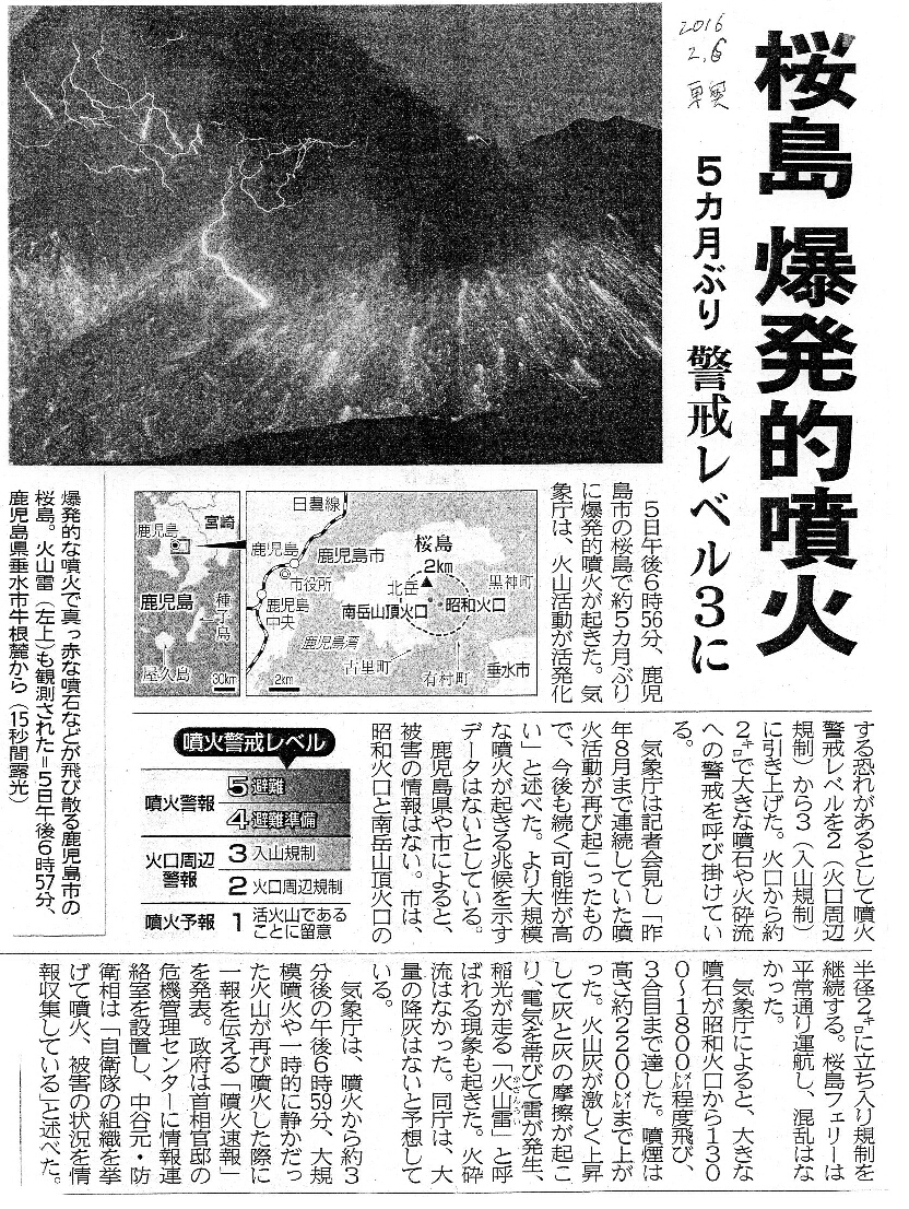 [2016_02_06_02]桜島 爆発的噴火 5カ月ぶり 警戒レベル3に(東奥日報2016年2月6日)