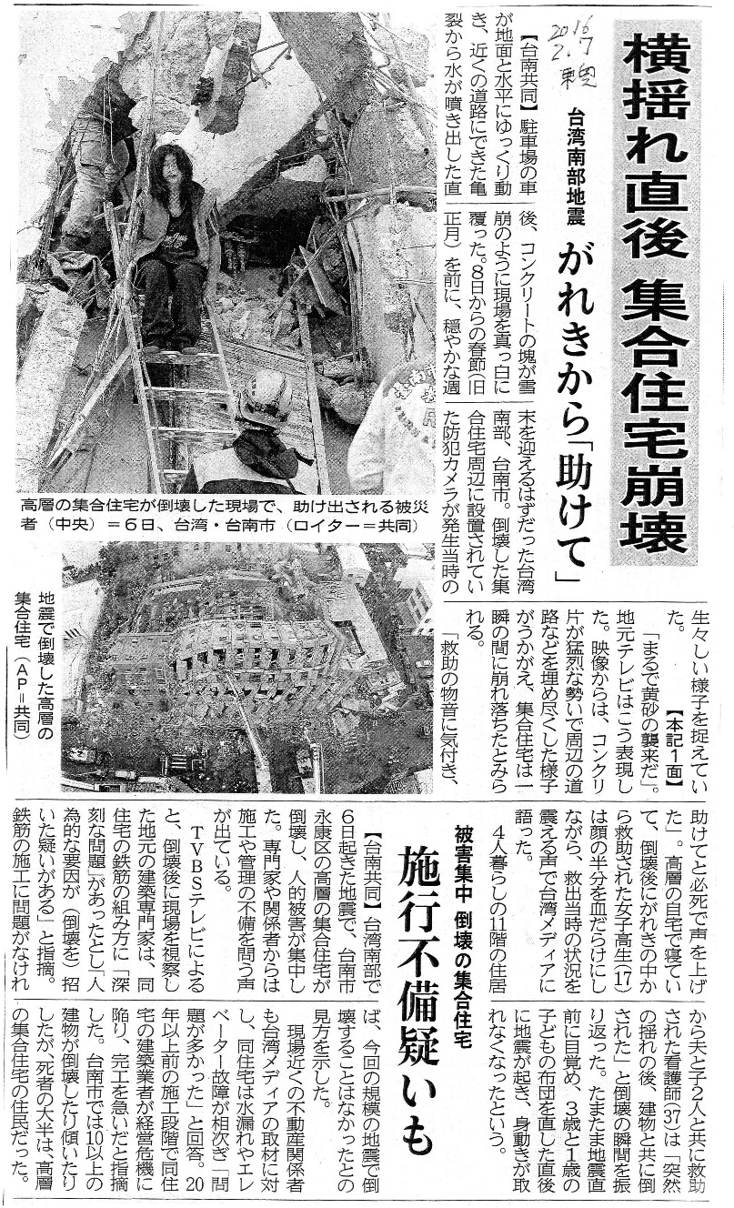 [2016_02_07_03]横揺れ直後 集合住宅崩壊 台湾南部地震 がれきから「助けて」 被害集中 倒壊の集合住宅 施工不備疑いも(東奥日報2016年2月7日)
