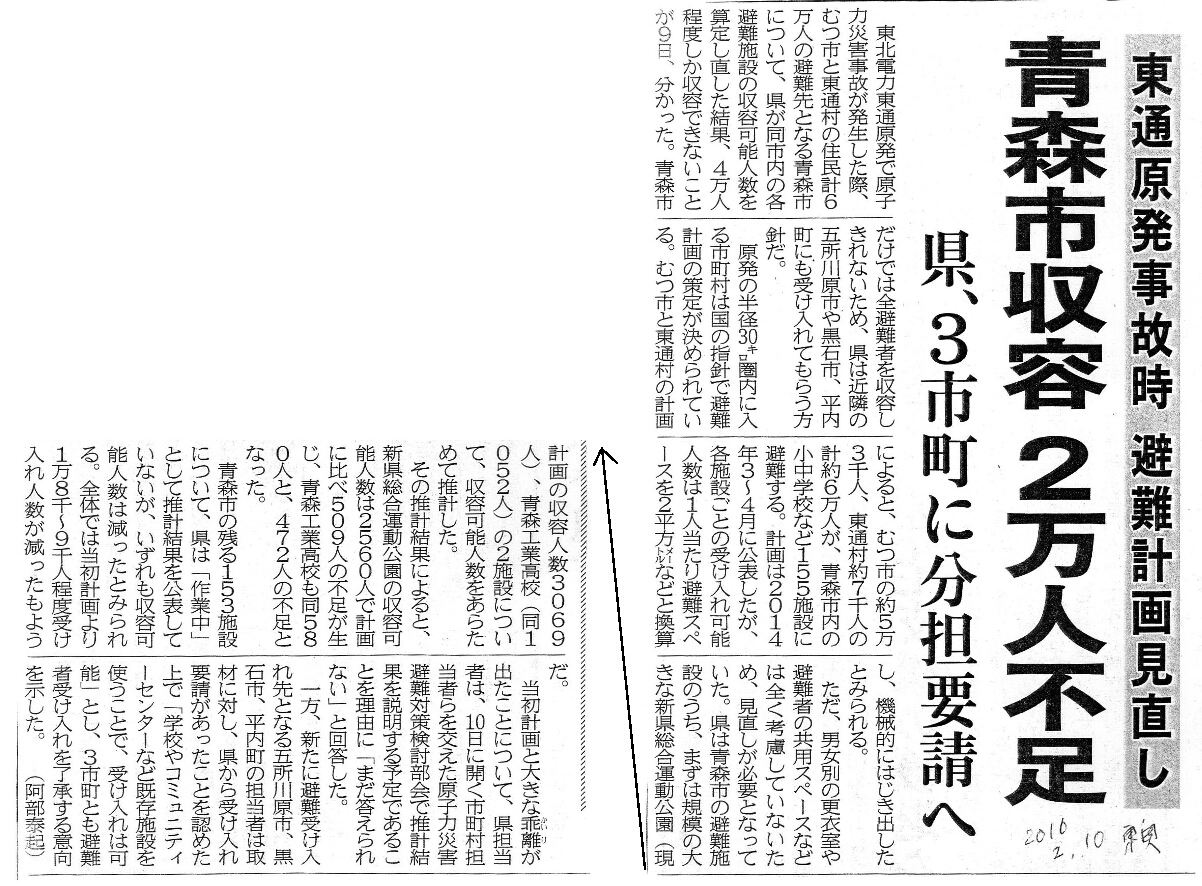 | [2016_02_10_02]東通原発事故時 避難計画見直し 青森市収容 2万人不足 県、3市町に分担要請へ(東奥日報2016年2月10日) |