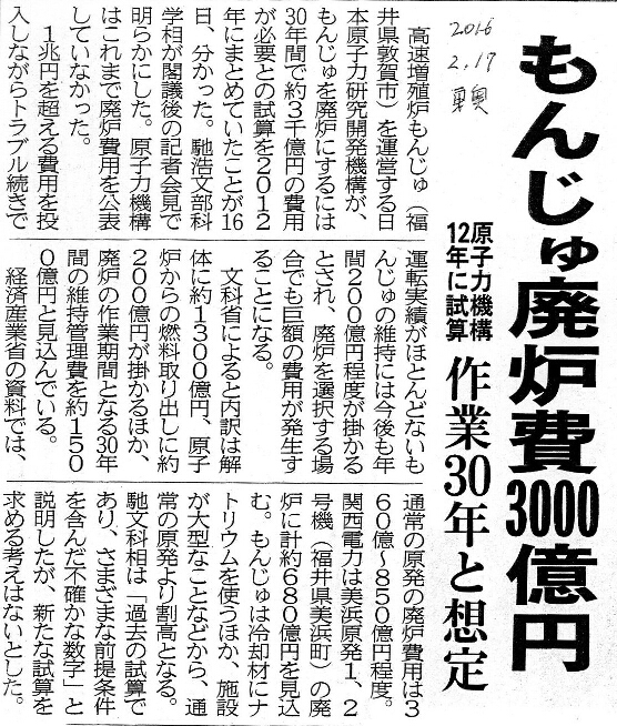 [2016_02_17_01]もんじゅ廃炉費3000億円 原子力機構 12年に試算 作業30年と想定(東奥日報2016年2月17日)