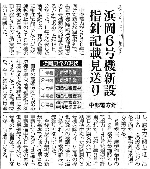 [2016_02_19_02]浜岡6号機新設 指針記載見送り 中部電方針(東奥日報2016年2月19日)
