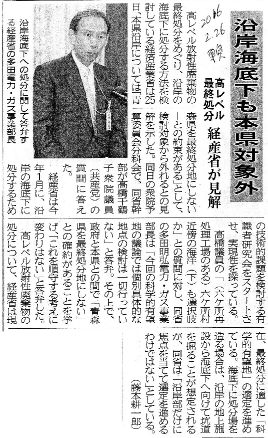 [2016_02_26_01]沿岸海底下も本県対象外 高レベル最終処分 経産省が見解(東奥日報2016年2月26日)