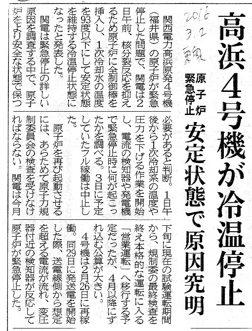 [2016_03_02_01]高浜4号機が冷温停止 原子炉緊急停止 安定状態で原因究明(東奥日報2016年3月2日)