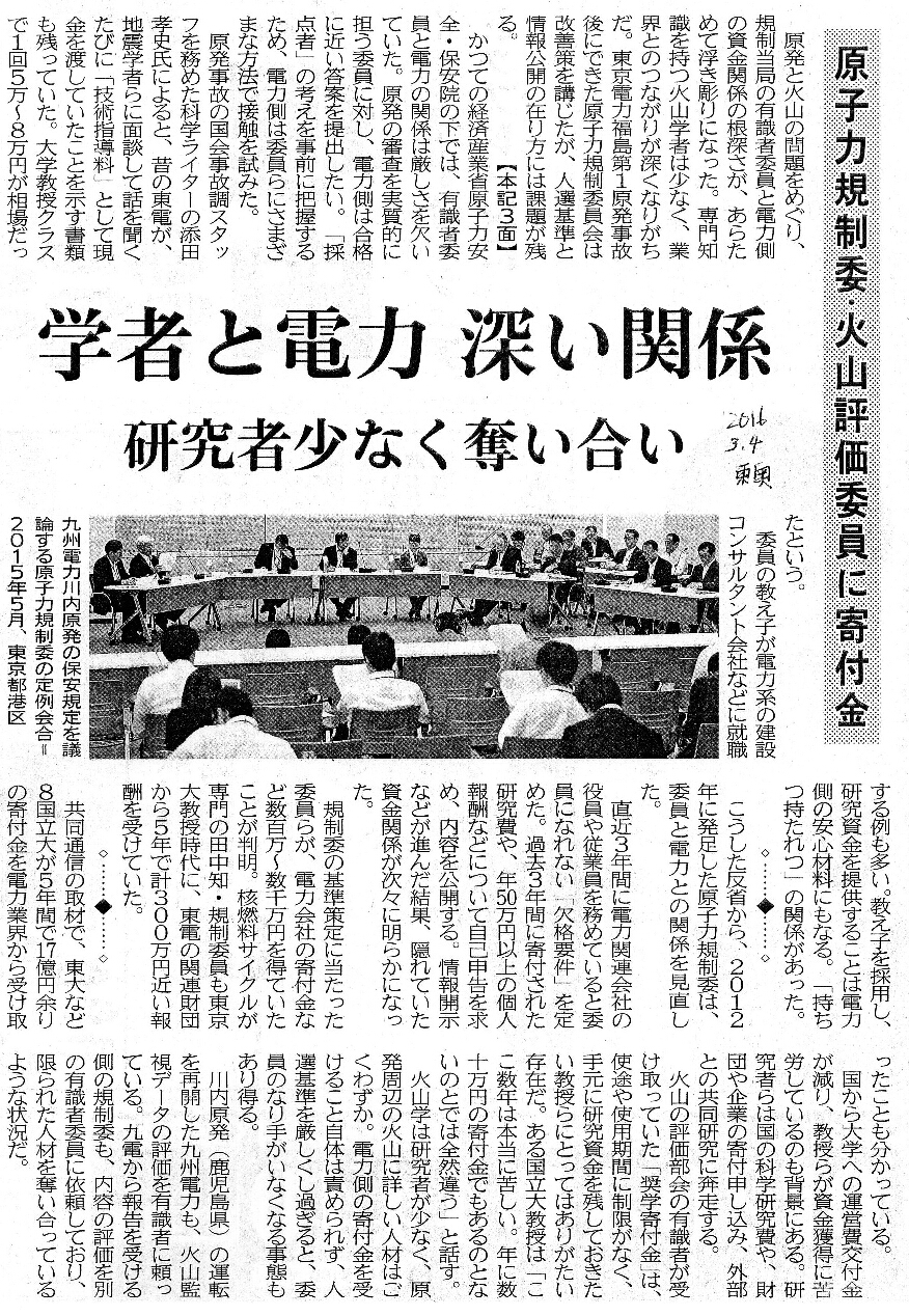 [2016_03_04_02]原子力規制委・火山評価委員に寄付金 学者と電力 深い関係 研究者少なく奪い合い(東奥日報2016年3月4日)