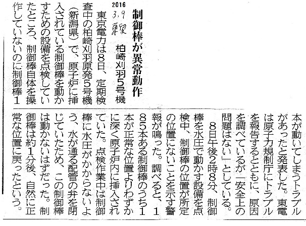 [2016_03_09_01]制御棒が異常動作 柏崎刈羽5号機(東奥日報2016年3月9日)