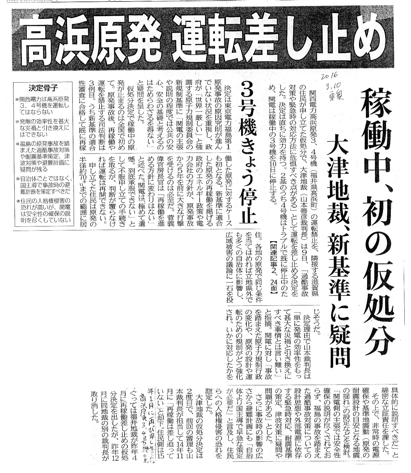 [2016_03_10_01]高浜原発運転差し止め 稼働中、初の仮処分 大津地裁、新基準に疑問 3号機きょう停止(東奥日報2016年3月10日)