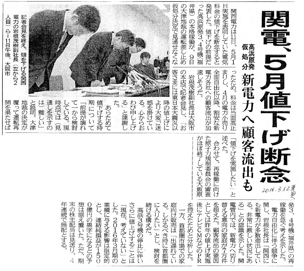 | [2016_03_12_02]関電、5月値下げ断念 高浜原発仮処分 新電力へ顧客流出も(東奥日報2016年3月12日) |