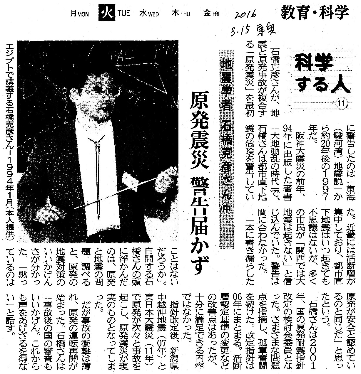 [2016_03_15_02]科学する人11 地震学者 石橋克彦さん(中) 原発震災 警告届かず(東奥日報2016年3月15日)