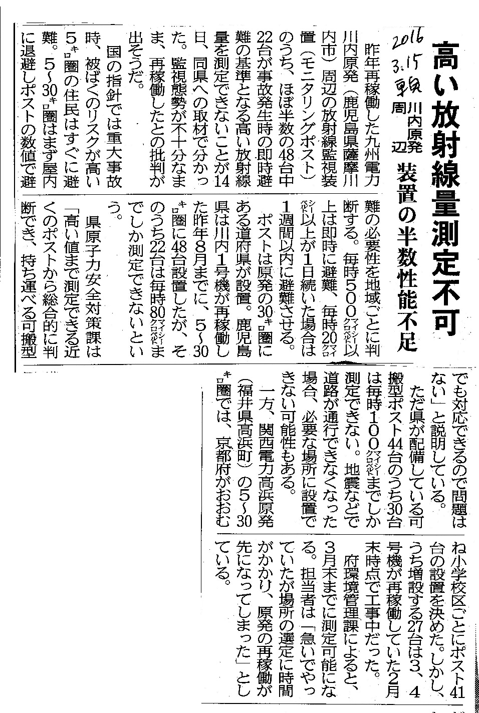 [2016_03_15_04]高い放射線量測定不可 川内原発周辺 装置の半数性能不足(東奥日報2016年3月15日)