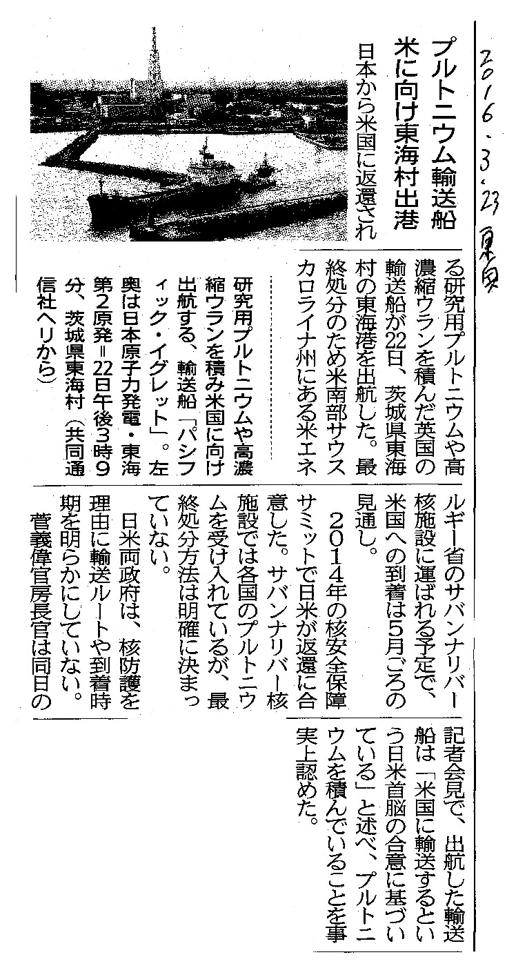 [2016_03_23_01]プルトニウム輸送船 米に向け東海村出港(東奥日報2016年3月23日)