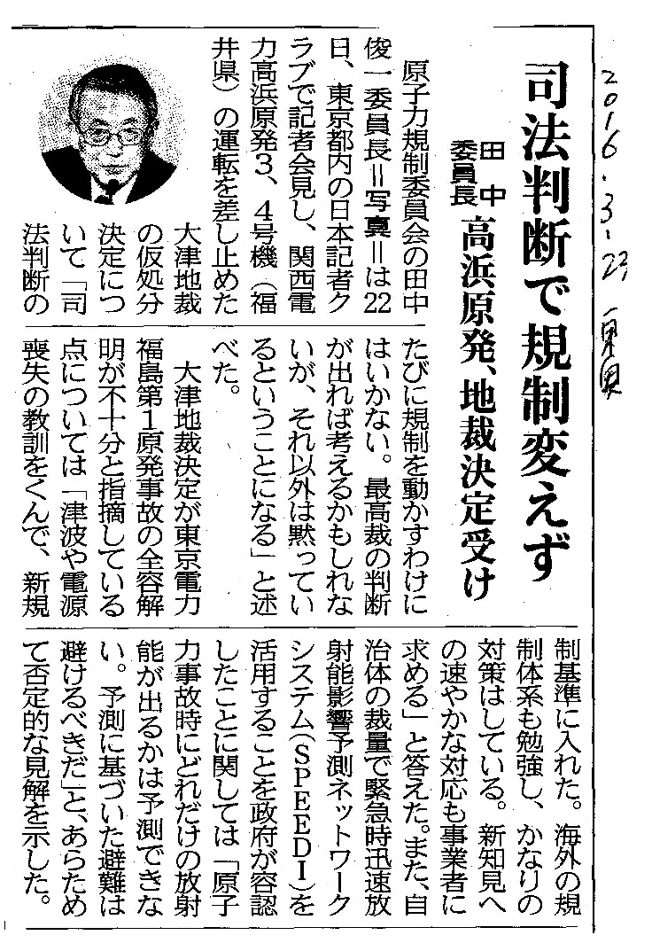 [2016_03_23_02]司法判断で規制変えず 田中委員長 高浜原発、地裁決定受け(東奥日報2016年3月23日)