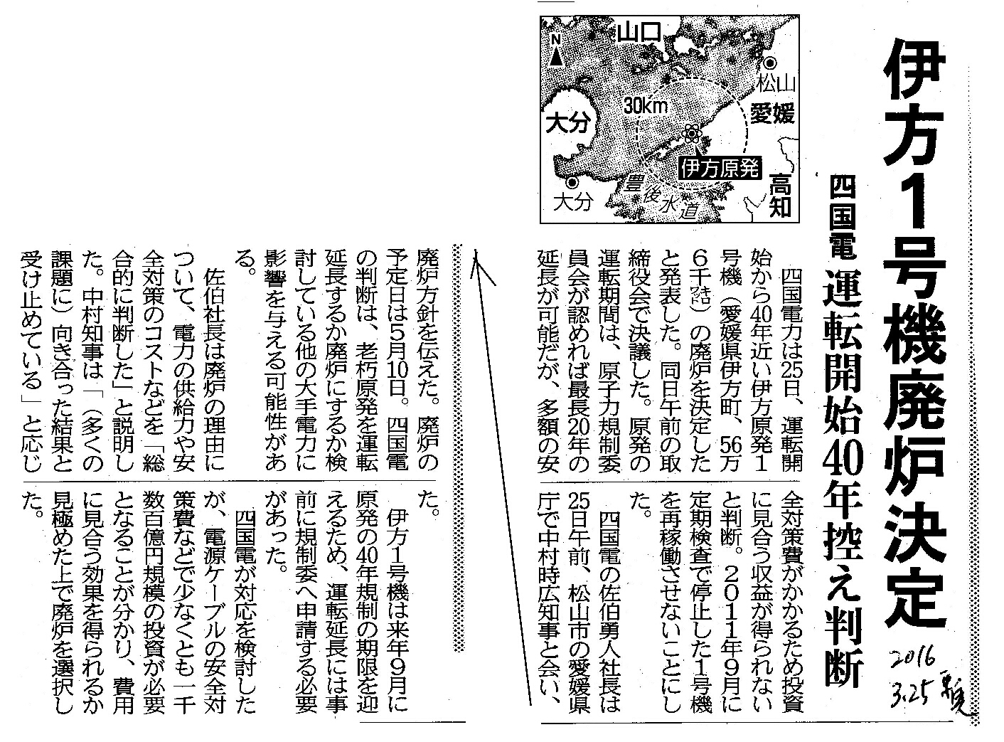 [2016_03_25_03]伊方1号機 廃炉決定 四国電 運転開始40年控え判断(東奥日報2016年3月25日)
