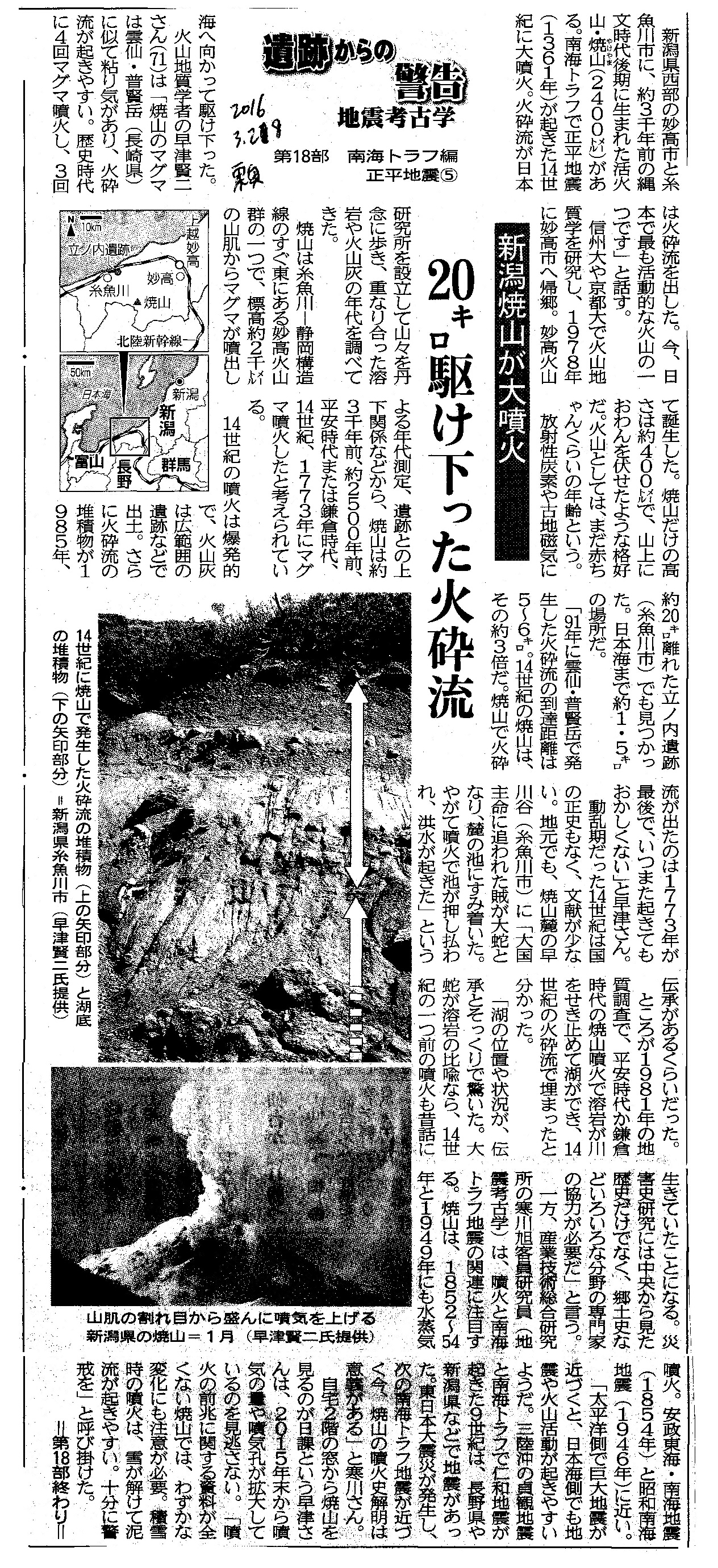 [2016_03_28_04]遺跡からの警告 地震考古学 第18部 南海トラフ編 正平地震5 新潟焼山が大噴火 20キロ駆け下った火砕流(東奥日報2016年3月28日)
